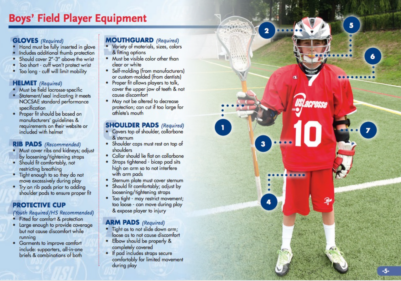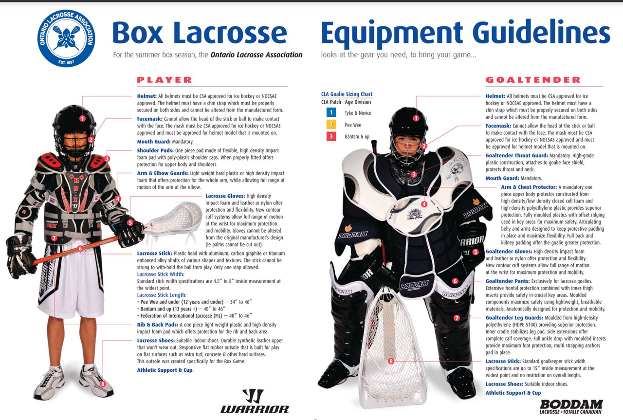 Sixes Field EquiptmentBoys will require Full Hockey or Field Lacrosse Helmet, Gloves, Cup, Mouth Guard and Stick. Goalies for Boys will abide by OMFLL and OWFL rules respectively.